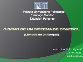El documento presenta un diagrama de un sistema automático y manual para llenar un tanque de agua a su nivel deseado. El sistema consiste en una empresa de aguas, tuberías, una válvula, un tanque de agua, un flotador electrónico y un controlador. El proceso de llenado comienza cuando el agua de la empresa llega a la válvula a través de las tuberías, la cual se abre mediante una señal del controlador. El flotador electrónico en el tanque monitorea el nivel de agua