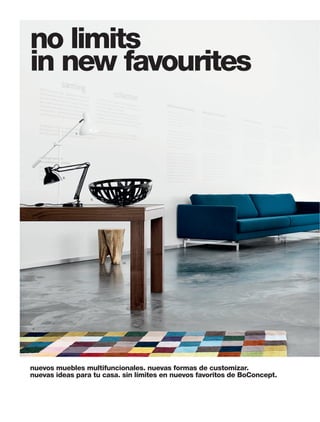 Este documento presenta nuevos productos y opciones de diseño de la marca BoConcept. Se muestran muebles multifuncionales y modulares con diferentes colores y tamaños que permiten customizar el hogar sin límites. El documento también destaca los servicios de asesoría en tienda y diseño 3D para ayudar a los clientes a encontrar la configuración perfecta para su hogar.