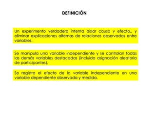 Este documento describe los diseños experimentales y sus características fundamentales. Un diseño experimental implica la manipulación de al menos una variable independiente y la medición de sus efectos en una variable dependiente. Los diseños experimentales más simples incluyen muestras independientes, mediciones repetidas, pares igualados y participante único. Los experimentos aíslan causa y efecto y controlan variables alternas, pero también tienen limitaciones como la reactividad de los participantes y la artificialidad de las condiciones.