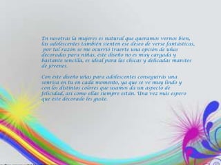 Este documento presenta tres diseños de uñas sencillos y coloridos para adolescentes. El primer diseño consiste en pintar las uñas de diferentes colores y agregar puntitos para dar un aspecto de felicidad. El segundo diseño presenta una abeja volando sobre un fondo de color turquesa. El tercer diseño alienta a las adolescentes a diseñar sus propias uñas a diario para combinar con su look.