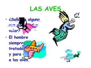 El documento resume las características básicas de las aves, incluyendo que nacen de huevos, tienen plumas y sangre caliente, y menciona algunas aves específicas de Chile como el cóndor andino y el picaflor de Arica. También destaca que el avestruz es la más grande del mundo y el zunzuncito cubano la más pequeña.