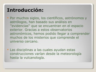 Este documento describe los observatorios astronómicos, sus funciones y los principales observatorios en Chile. Explica que un observatorio astronómico es una construcción destinada al estudio de los cuerpos celestes y el cielo que se ubica en lugares con condiciones climáticas apropiadas. Sus funciones incluyen la astronomía, climatología y meteorología. Chile es considerado uno de los mejores lugares debido a su clima seco y falta de nubes, y aloja cinco importantes observatorios: La Silla, Cerro Tololo,