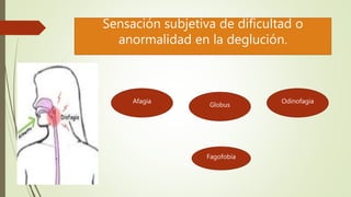 La disfagia se refiere a la dificultad para tragar. Puede ser orofaríngea o esofágica. La disfagia orofaríngea ocurre cuando el bolo alimenticio no puede ser propulsado desde la faringe al esófago, generalmente debido a trastornos neurológicos o musculares. La disfagia esofágica ocurre una vez que el bolo ha pasado la faringe, pudiendo deberse a obstrucciones mecánicas o trastornos de la motilidad esofág