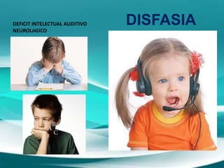 La disfasia es un trastorno del lenguaje caracterizado por severas dificultades en la adquisición del lenguaje oral, sin un déficit intelectual generalizado. Puede deberse a causas neurológicas, auditivas o desconocidas. Se clasifica en tres niveles de gravedad y su tratamiento incluye ejercicios de discriminación auditiva, bucofaciales, de organización semántica y expresión oral para mejorar las habilidades lingüísticas.