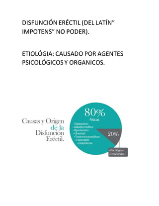 Este documento trata sobre la disfunción eréctil, que se define como la incapacidad repetida de lograr o mantener una erección firme para tener una relación sexual satisfactoria. Explica que puede deberse a factores psicológicos u orgánicos como enfermedades, tabaquismo, alcoholismo, falta de testosterona, entre otros. También describe los síntomas, diagnóstico y tratamientos, que incluyen cambios en el estilo de vida, ejercicio, terapia y en algunos casos medicamentos como el Viagra.