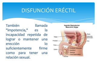 Este documento describe la disfunción eréctil, también conocida como impotencia, que es la incapacidad repetida de lograr o mantener una erección lo suficientemente firme para tener relaciones sexuales. Explica que más del 50% de los hombres mayores de 40 años la padecen y que puede deberse a factores como el uso de tabaco, diabetes, hipertensión u obesidad. Los tratamientos van desde cambios en el estilo de vida hasta dispositivos de vacío, medicamentos orales e implantes quirúrgicos.