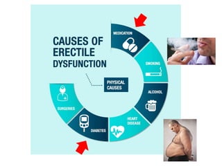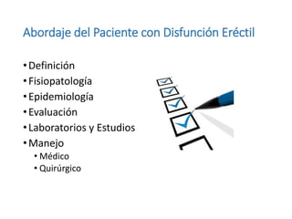 Este documento trata sobre el abordaje del paciente con disfunción eréctil. Define la disfunción eréctil y explica su fisiopatología. Luego describe la epidemiología, evaluación diagnóstica incluyendo historia clínica, exámen físico y laboratorios. Finalmente discute el manejo médico con inhibidores de fosfodiesterasa 5, inyección intracavernosa, dispositivos de vacío y prótesis penil, así como terapias experimentales como ondas de choque y células madre.