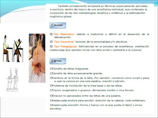La disgrafía es un trastorno de la escritura que afecta la forma o contenido de la escritura en niños sin problemas intelectuales, neurológicos u otros. Se caracteriza por síntomas como letras inclinadas o apiñadas y texto difícil de comprender. Las causas incluyen dificultades neuropsicológicas, trastornos de lateralización, motricidad débil, y problemas de percepción espacial y del esquema corporal. Existen dos tipos principales: disgrafía motriz relacionada a la motricidad fina