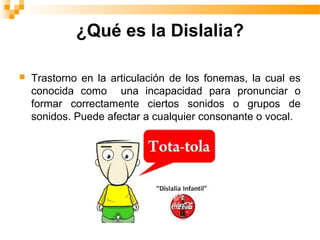 La dislalia es un trastorno en la articulación de los fonemas que causa dificultad para pronunciar correctamente ciertos sonidos. Existen varios tipos de dislalia clasificados por su causa, y los errores comunes incluyen sustitución, omisión, inserción o distorsión de sonidos. Los profesionales deben evaluar la articulación, respiración, ritmo y habilidades auditivas del paciente, así como el impacto en la lectura y escritura, utilizando tests estandarizados.