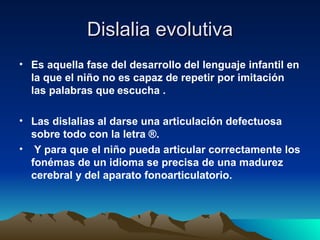 La dislalia evolutiva es una fase normal del desarrollo del lenguaje infantil donde los niños tienen dificultad para repetir palabras. Se debe a que sus cerebros y sistemas fonéticos aún no han madurado lo suficiente para articular sonidos de forma correcta. Generalmente, estas dificultades desaparecen para los 4-5 años sin necesidad de tratamiento, siempre que los padres hablen claramente con sus hijos sin corregirlos constantemente.
