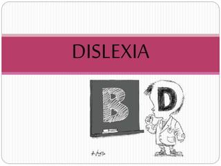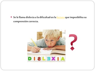 La dislexia es una dificultad en la lectura que impide su comprensión correcta y se define como una discrepancia entre el potencial de aprendizaje y el rendimiento de un sujeto sin problemas sensoriales, físicos o educativos. Existen factores hereditarios que predisponen a la dislexia aunque no están claros otros factores como causas genéticas o problemas en el embarazo. La dislexia puede ser adquirida por una lesión cerebral o evolutiva si el sujeto presenta dificultades inherentes para leer, y se clasifica según