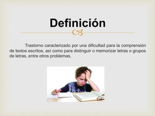 Este documento describe la dislexia, un trastorno caracterizado por dificultades en la comprensión de textos escritos y en distinguir letras. Explica que los niños disléxicos parecen inteligentes pero tienen problemas de lectura, escritura y ortografía. También detalla los diferentes tipos de dislexia y sus síntomas, y cómo la dislexia a menudo se asocia con otros trastornos. Además, resalta la importancia del diagnóstico temprano y el tratamiento continuo, incluyendo ejercicios de rehabilitación