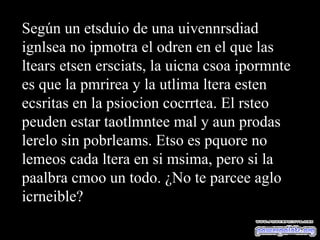 Un estudio de una universidad inglesa descubrió que el orden de las letras dentro de una palabra no es importante para la comprensión, siempre que la primera y última letra estén en la posición correcta. El cerebro no lee cada letra individualmente, sino la palabra como un todo. Esto sugiere que las personas disléxicas pueden leer palabras aunque las letras estén desordenadas.