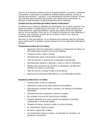 Este documento proporciona información sobre la dislexia dirigida a educadores. Explica que la dislexia es un trastorno del aprendizaje causado por una alteración en las zonas cerebrales del lenguaje que afecta la lectura, escritura y aprendizaje. Detalla los síntomas de dislexia que pueden observarse en etapas preescolares, escolares y adolescentes. También ofrece estrategias que los educadores pueden implementar para ayudar a estudiantes con dislexia, como enseñanza multisensorial,
