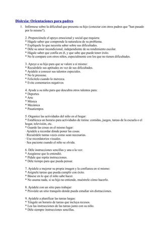 El documento proporciona orientaciones para padres de niños con dislexia, incluyendo informarse sobre la condición, brindar apoyo emocional, ayudar a descubrir talentos adicionales, organizar actividades en el hogar, colaborar con maestros, y sugerir adaptaciones en el aula.
