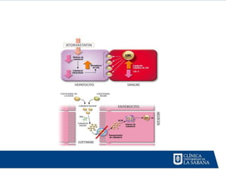 Este documento clasifica y resume las dislipidemias según su perfil lipídico, origen y presentación clínica. Describe las categorías de riesgo cardiovascular y los factores de riesgo mayores para enfermedad coronaria. Explica las opciones de tratamiento incluyendo modificación del estilo de vida, estatinas, secuestradores de ácidos biliares y fibratos.