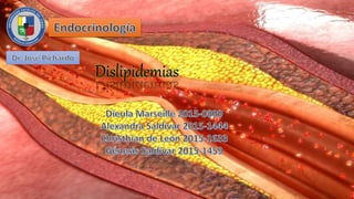 El documento aborda las dislipidemias, clasificándolas en hipercolesterolemia, hipertrigliceridemia e hiperlipidemias mixtas. Detalla su etiología, métodos de diagnóstico y síntomas, además de los tratamientos farmacológicos y de estilo de vida recomendados para su manejo. También incluye la importancia del cribado y el tratamiento de causas secundarias relacionadas con enfermedades concomitantes.