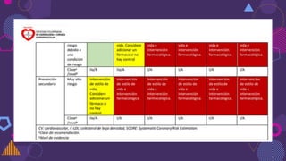 El documento habla sobre las dislipidemias, que son trastornos en los niveles de lípidos en la sangre como el colesterol y los triglicéridos. Explica que pueden ser primarias o secundarias y que factores como la genética, la dieta y el estilo de vida influyen en su desarrollo. También describe el síndrome metabólico, que involucra dislipidemia y otros factores de riesgo cardiovascular. El tratamiento incluye cambios en el estilo de vida y en algunos casos medicamentos para controlar