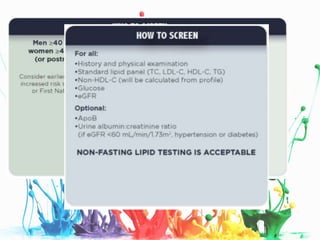 1. El documento resume las principales guías y lineamientos para el manejo de las dislipidemias.