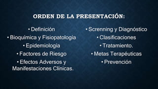 Este documento presenta una introducción sobre dislipidemias. Define las dislipidemias como alteraciones del metabolismo lipídico que cursan con un aumento de los niveles plasmáticos del colesterol y/o los triglicéridos. Explica brevemente la bioquímica y fisiopatología de los lípidos, así como factores de riesgo, efectos adversos, clasificaciones y tratamiento de las dislipidemias.