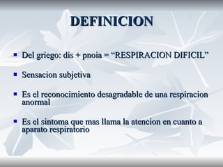 1) El documento define la disnea como una sensación subjetiva de respiración difícil, reconociendo una respiración anormal.