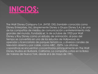 La compañía Walt Disney fue fundada en 1923 por Walt Disney y su hermano Roy Disney como un estudio de animación. A lo largo de los años se ha convertido en uno de los estudios de cine más grandes de Hollywood y opera parques temáticos y canales de televisión. Walt Disney creó personajes icónicos como Mickey Mouse y películas animadas exitosas como Blancanieves y los siete enanitos. Disneyland, el primer parque temático de Disney, abrió en 1955 y ha recibido cerca de 600 millones de visitantes desde entonces.