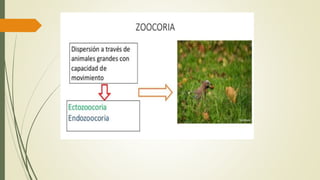 El documento trata sobre la dispersión de propágulos en plantas, analizando diferentes estrategias como la anemocoria y la zoocoria, así como los mecanismos de dispersión activa y pasiva. Se discuten diversos tipos de dispersión y sus implicaciones evolutivas, destacando cómo la capacidad de dispersión puede influir en la colonización y diversidad de especies. También se abordan modelos de dispersión y ejemplos específicos de formas de transporte de semillas y organismos.