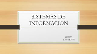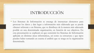 Los sistemas de información son conjuntos ordenados de recursos interconectados que permiten la administración, procesamiento y recuperación de datos en una organización, facilitando la toma de decisiones gerenciales. Existen diversos tipos de sistemas, como los de procesamiento de transacciones, soporte a decisiones y colaboración empresarial, cada uno con funciones específicas. Su correcta implementación y mantenimiento son cruciales para optimizar el acceso a la información y mejorar la eficiencia organizacional.