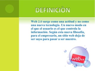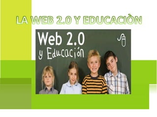 El documento describe el concepto de Web 2.0 como una actitud que permite a los usuarios controlar la información y participar activamente en la creación de contenido online, con ejemplos como Flickr y YouTube. Se enfatiza la transformación del papel del docente hacia un mediador en el aprendizaje, utilizando herramientas tecnológicas para facilitar la educación, mejorando la comunicación y el acceso a información. Además, se presentan las ventajas y desventajas de esta modalidad en el proceso educativo, destacando la interacción, la creatividad y el autoaprendizaje como beneficios clave.