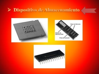 Este documento describe diferentes tipos de dispositivos periféricos de entrada, salida y almacenamiento. Entre los dispositivos de entrada se mencionan el mouse, teclado, scanner y micrófono. Los dispositivos de salida incluyen la pantalla, impresora y bocinas. Los dispositivos de almacenamiento pueden ser internos como la memoria RAM y ROM o externos como los discos duros, CDs y memorias USB.