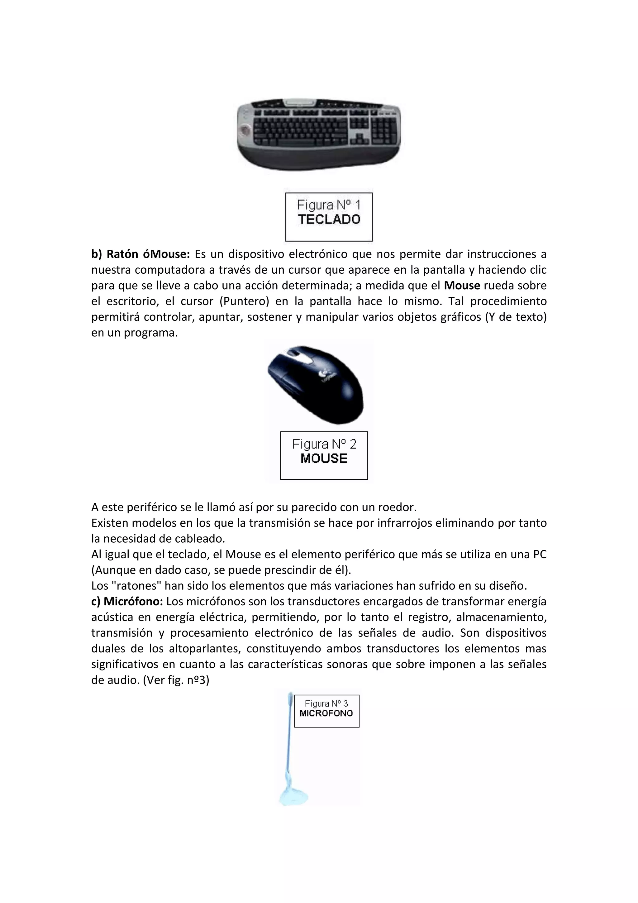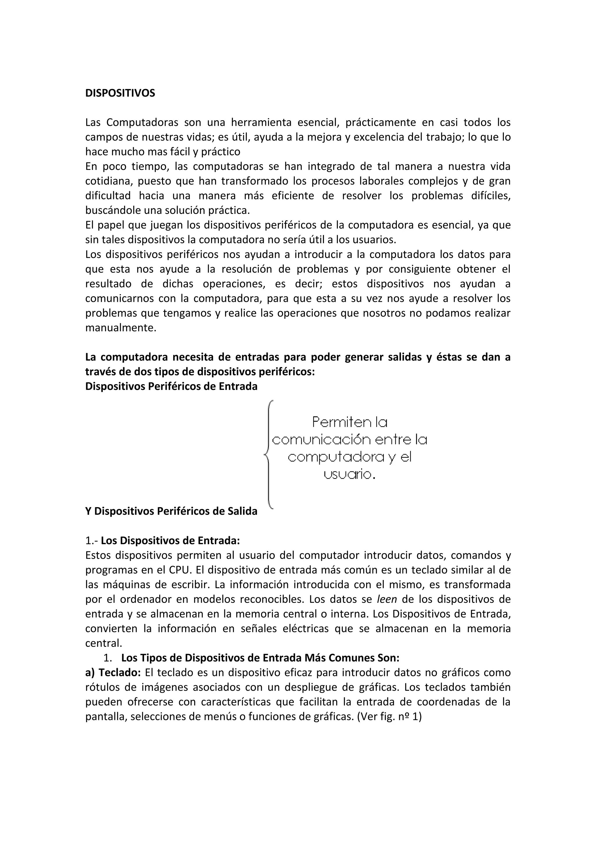 El documento describe los diferentes tipos de dispositivos de entrada y salida para computadoras. Explica que los dispositivos de entrada como el teclado, mouse, micrófono y escáner permiten introducir datos a la computadora, mientras que los dispositivos de salida como la pantalla, impresora y altavoces permiten ver los resultados. En total menciona 11 dispositivos de entrada y salida comúnmente usados y brinda detalles sobre su funcionamiento.