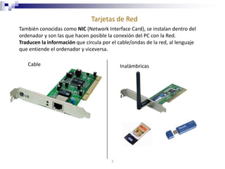 Este documento describe diferentes dispositivos de red como tarjetas de red, cables inalámbricos, concentradores, conmutadores, encaminadores y puentes. Explica que las tarjetas de red permiten la conexión de un ordenador a la red, traduciendo la información entre los protocolos de la red y el ordenador. Los concentradores, conmutadores y encaminadores distribuyen y guían las señales eléctricas entre los nodos de la red. Un puente une segmentos lógicos de red evitando colisiones entre ellos pero permitiendo la comunic