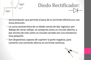 Este documento describe diferentes dispositivos electrónicos como diodos rectificadores, diodos Zener, transistores BJT, MOSFET, IGBT, UJT, SCR, TRIAC, DIAC y compuertas lógicas. Explica sus características y funciones principales y provee ejemplos de circuitos para cada uno.