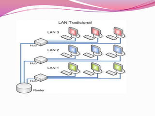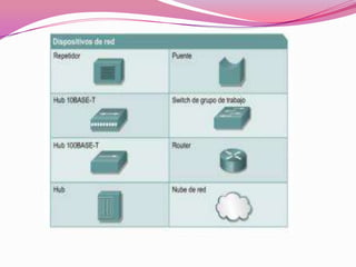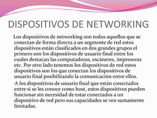 Este documento describe diferentes tipos de dispositivos de red y protocolos. Explica que los dispositivos de red incluyen tarjetas de red, repetidores, hubs, puentes, switches y routers. También describe varios protocolos de red comunes como IPX/SPX, NetBIOS, TCP/IP y AppleTalk. Finalmente, resume las características de las redes LAN y WAN.