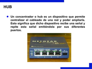 Un hub repite las señales recibidas por sus puertos, permitiendo ampliar la red. Los switches son dispositivos inteligentes que envían datos a través de la red basándose en las direcciones MAC. Los bridges y routers conectan diferentes segmentos de red, pero los routers trabajan a nivel de red y pueden enrutar paquetes entre redes distintas usando diferentes protocolos.