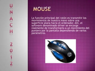 El ratón es un dispositivo de entrada que transmite los movimientos de la mano sobre una superficie plana al ordenador para mover el cursor en la pantalla. Es el dispositivo de entrada más común y se utiliza para introducir comandos, texto y números. Una cámara web es una cámara conectada a Internet que puede tomar diferentes formas y usos como tomar fotos o videos.