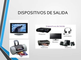 El documento describe varios dispositivos de salida comunes para computadoras, incluyendo monitores, impresoras, bocinas, plotters, proyectores de datos y discos compactos como CD-ROM y DVD. Enumera seis integrantes del grupo y describe brevemente la función de los monitores, plotters, bocinas e impresoras como dispositivos de salida primarios para computadoras.