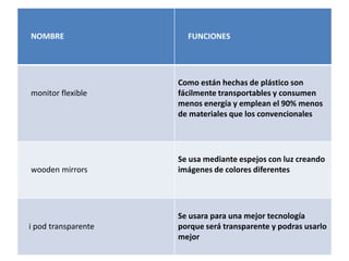 El documento habla sobre los dispositivos de salida de datos además de las pantallas de televisor como monitores, impresoras, bocinas, plotters y graficadoras. Menciona que sería posible construir superficies flexibles para proyectar o ver datos de una computadora o consola de videojuegos, lo que tendría ventajas de ser accesible y fácil de usar. Finalmente, señala que las consolas de videojuegos deben contar con monitores y controles.
