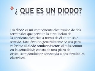 El documento proporciona información sobre diversos componentes electrónicos como diodos, transistores y resistencias. Explica que los diodos permiten el flujo de corriente eléctrica en un solo sentido, y que se usan para rectificar corriente alterna y estabilizar tensión y corriente. También describe los diferentes tipos de diodos y sus usos. Asimismo, define al transistor como un dispositivo semiconductor que amplifica señales de entrada y cumple funciones como conmutador o oscilador. Finalmente, explica que las resistencias producen caídas de