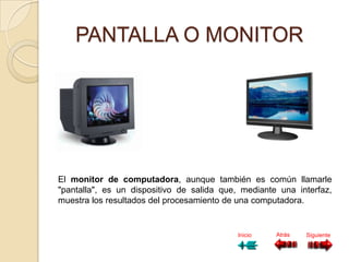 El documento describe los principales dispositivos físicos externos de un computador, incluyendo el monitor, impresora, teclado, mouse, parlantes, scanner, cámara web y micrófono. Cada dispositivo se explica brevemente, describiendo su función y propósito dentro de un sistema computacional.