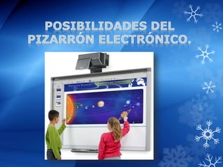 El documento describe los componentes principales de un pizarrón interactivo, incluyendo una computadora, video-proyector, pantalla interactiva y software especializado. El pizarrón interactivo permite proyectar contenido de la computadora sobre una superficie y hacer anotaciones de manera táctil, guardar y compartir estas anotaciones.