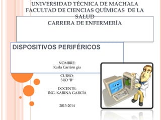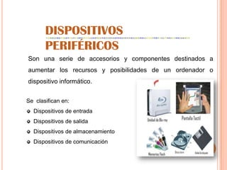 El documento clasifica y describe los principales tipos de dispositivos periféricos de una computadora, incluyendo dispositivos de entrada como teclados y mouse, dispositivos de salida como monitores e impresoras, dispositivos de almacenamiento como discos duros y unidades USB, y dispositivos de comunicación como routers y switches.