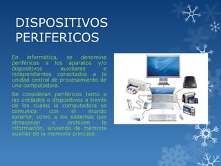 El documento clasifica y describe los diferentes tipos de dispositivos periféricos de una computadora. Explica que los dispositivos periféricos son aparatos auxiliares conectados a la unidad central de procesamiento y clasifica los periféricos en cuatro categorías: dispositivos de entrada, dispositivos de salida, dispositivos de almacenamiento y dispositivos de comunicación. Proporciona ejemplos de cada tipo de dispositivo periférico.