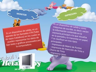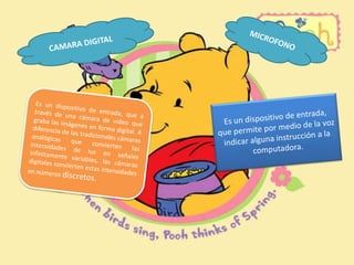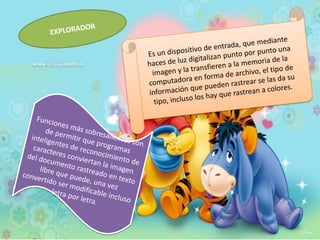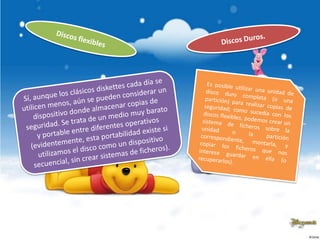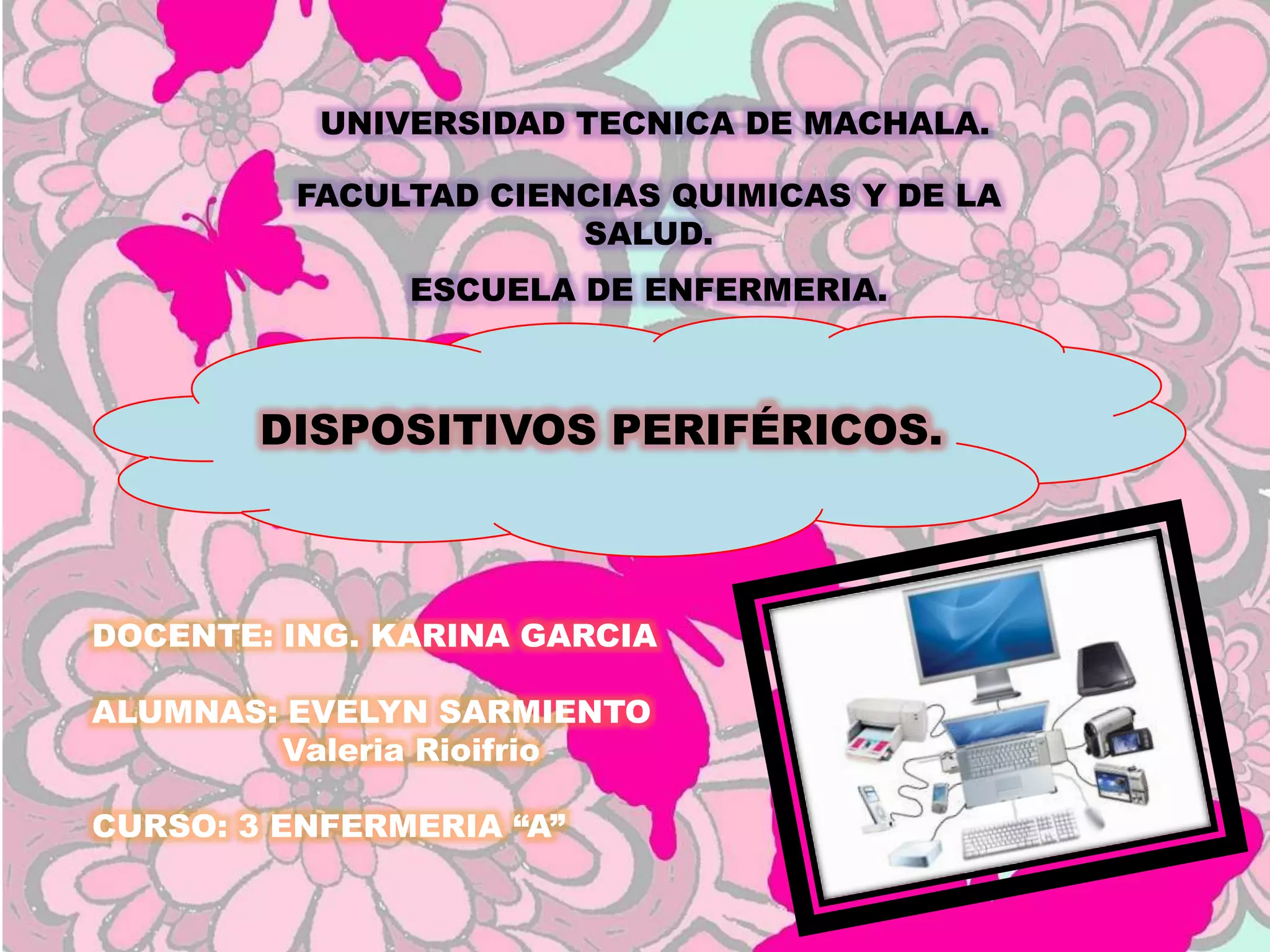 Este documento clasifica y describe los dispositivos periféricos de una computadora en tres categorías: dispositivos de entrada, dispositivos de salida y dispositivos de almacenamiento. Los dispositivos de entrada más comunes mencionados son el teclado, ratón, lápiz óptico y escáner. Los dispositivos de salida más comunes son el monitor e impresora. Los dispositivos de almacenamiento incluyen unidades de disco y cintas magnéticas que permiten grabar datos de forma permanente o temporal.