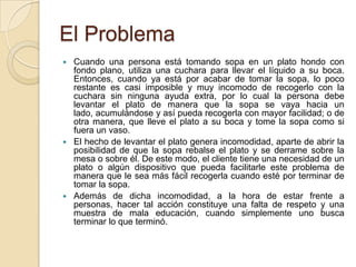 El documento describe un problema común al comer sopa en un plato hondo, ya que la última porción es difícil de recoger con la cuchara. Propone una solución de dos partes: 1) Un plato de sopa con un relleno que inclina el contenido hacia un lado para facilitar la recogida. 2) Una cuchara más profunda que recoja mejor la última porción. El objetivo es encontrar un método práctico y elegante para resolver este problema de manera sencilla y cómoda.