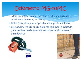 Este documento presenta información sobre varios dispositivos de medición de distancias, incluyendo odómetros, distanciómetros láser y niveles láser. Describe las características y usos de cada dispositivo.