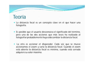 La distancia focal es la distancia entre el plano de la imagen y el plano de la óptica de una cámara. Afecta al ángulo de visión capturado, relacionándose una distancia focal baja con un ángulo amplio y una alta con un ángulo reducido. Los objetivos se clasifican en gran angular, normal y teleobjetivo dependiendo de su distancia focal y sus usos.