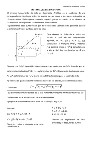 Este documento explica cómo calcular la distancia entre dos puntos en un plano cartesiano. Define las coordenadas de un punto y cómo representar puntos usando pares ordenados de números reales en un sistema de ejes x e y. Explica que la distancia entre dos puntos P1(x1,y1) y P2(x2,y2) se calcula como la raíz cuadrada de la suma de los cuadrados de las diferencias de sus coordenadas (x2-x1)2+(y2-y1)2. Proporciona un ejemplo numérico y