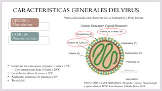 El documento describe las características generales del virus del moquillo canino, incluyendo su genéro, familia y supervivencia en diferentes ambientes. Explica la epidemiología, transmisión, patogenia, signos clínicos, diagnóstico y tratamiento de la enfermedad. Resalta que se trata de una enfermedad viral grave y altamente contagiosa que afecta a perros de todas las edades y razas, pudiendo transmitirse a través de secreciones, contacto directo y lugares concurridos por animales infectados.
