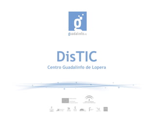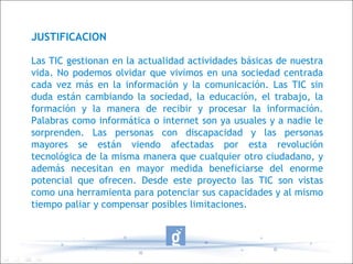El documento describe un proyecto para facilitar el acceso a las tecnologías de la información y la comunicación (TIC) a personas con discapacidades en Lopera. Los objetivos son mejorar las habilidades cognitivas y de vida independiente de las personas con discapacidad y concienciar a sus familias. El proyecto utilizará metodologías participativas y talleres para lograr estos objetivos con la ayuda de dinamizadores, trabajadores sociales y otros agentes.